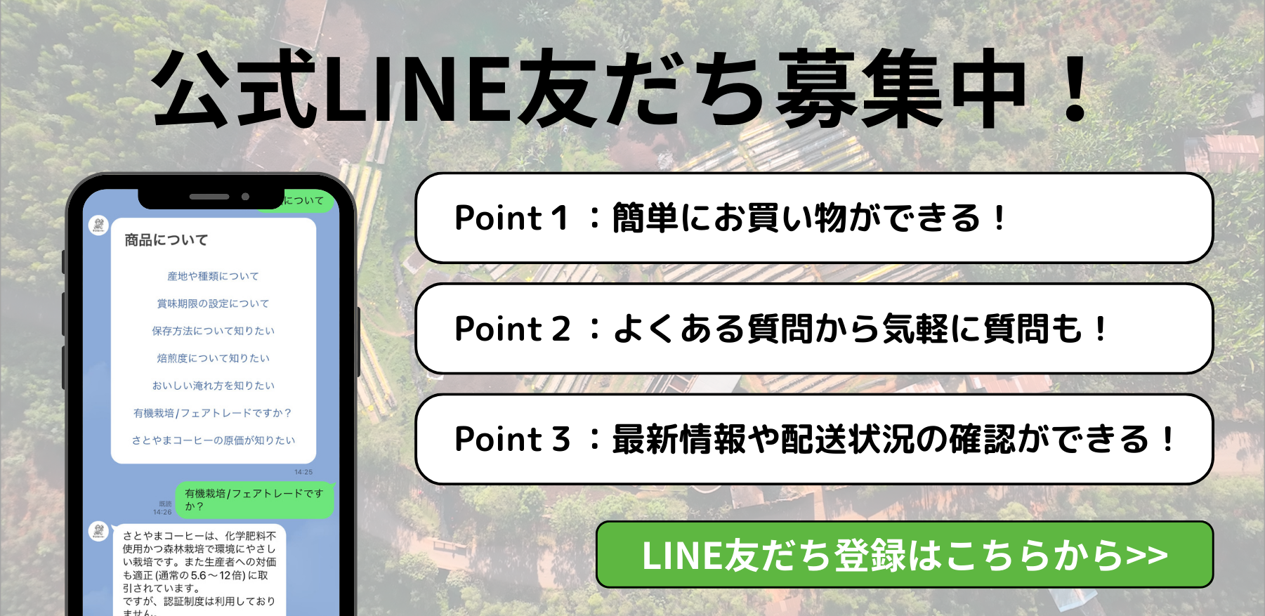 さとやまコーヒーは、化学肥料不使用かつ森林栽培で環境にやさしい栽培です。また生産者への対価も適正(通常の5.6〜12倍)に取引されています。